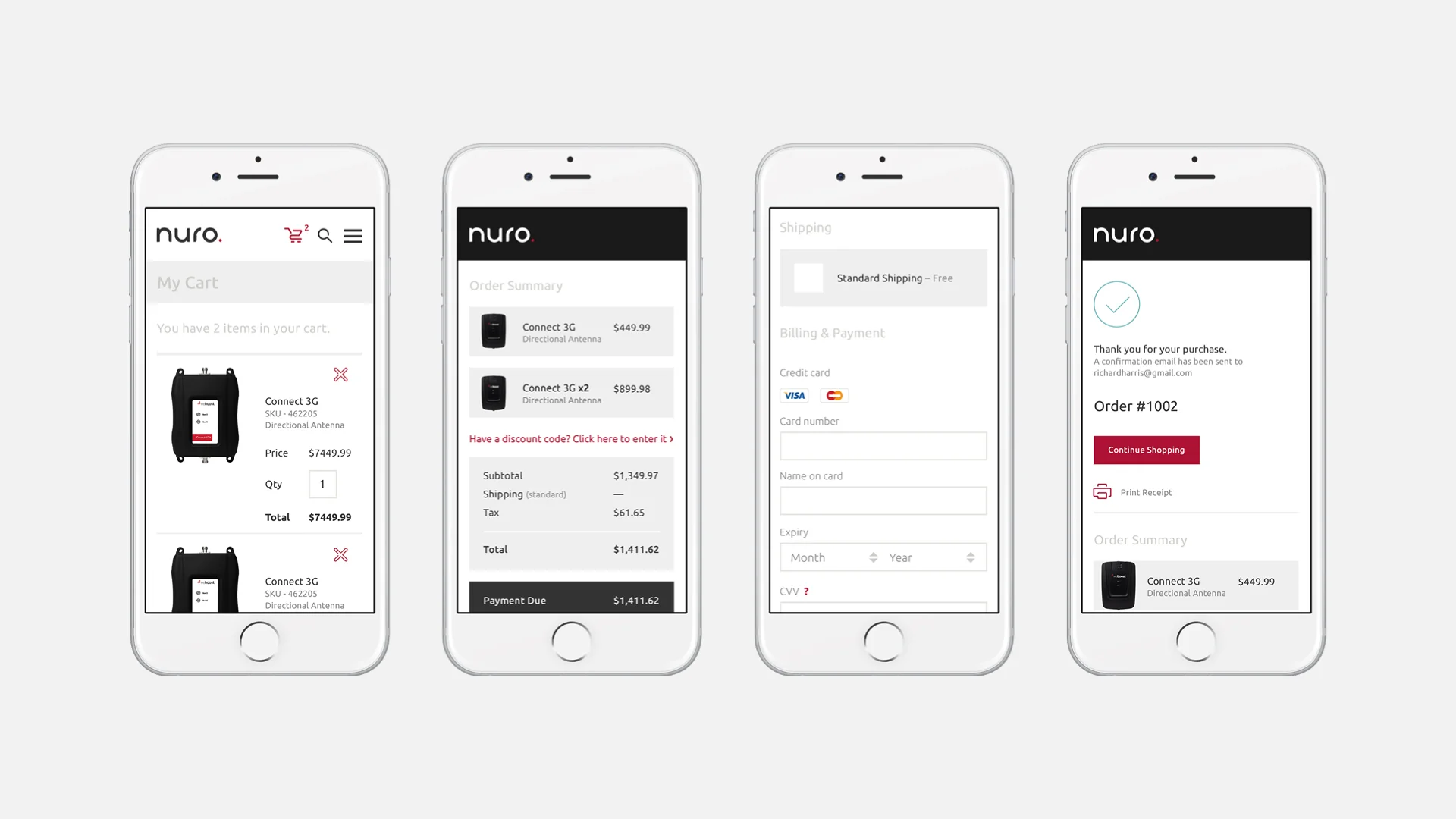 The checkout process was built on a customized Shopify e-commerce platform, completely new territory for the client as this was their first venture into the B2C market.